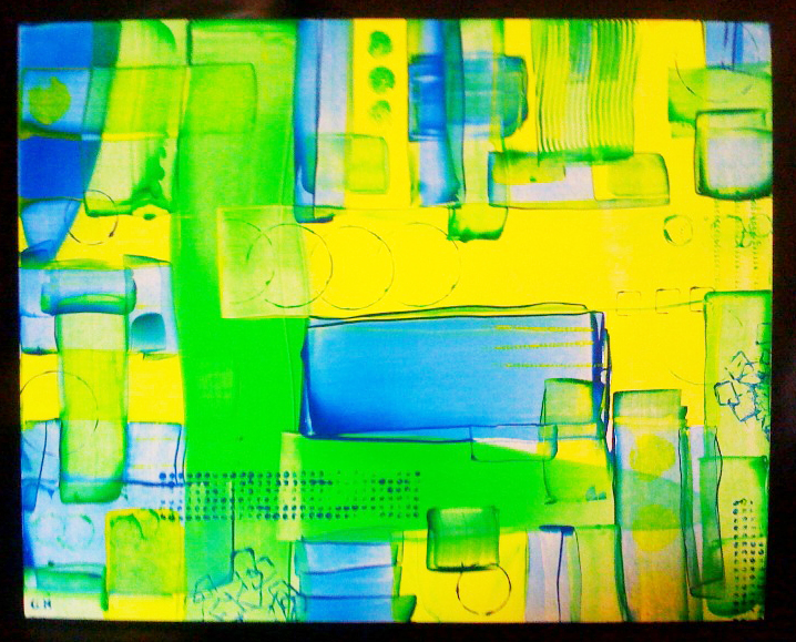 Awake - flourescent paints on 1 inch cradled gesso board. Sealed with polymer medium gloss. Size: 20x16 inches (WxH).