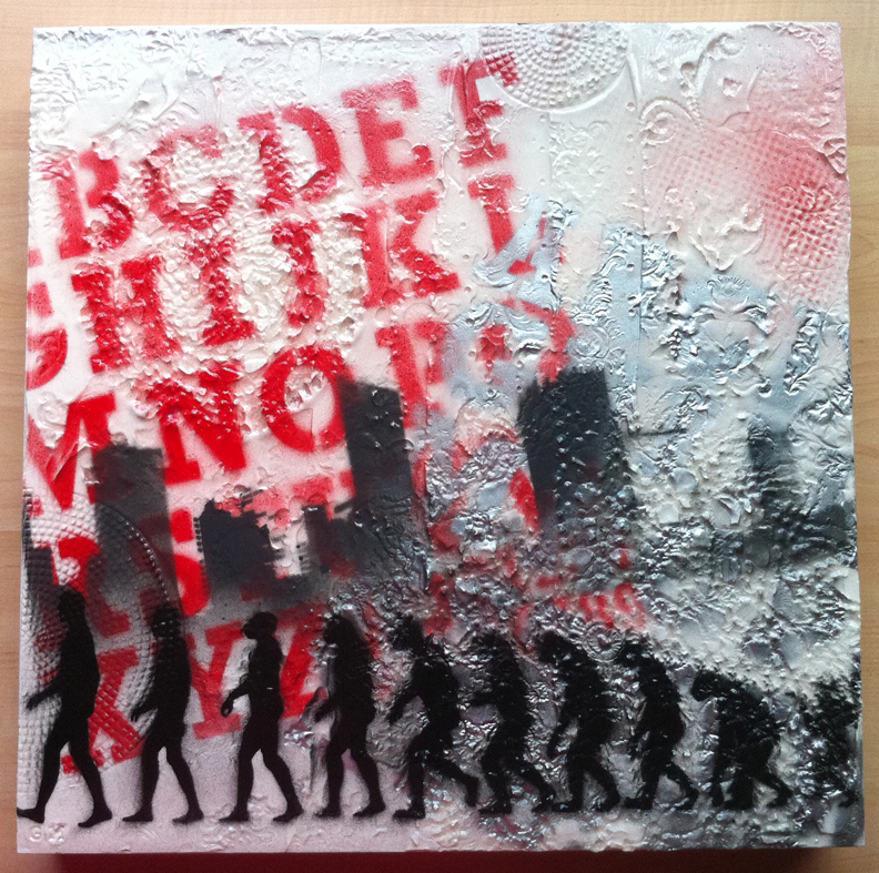 Language - textured joint compound and spray paint on 2 inch cradled gesso board.