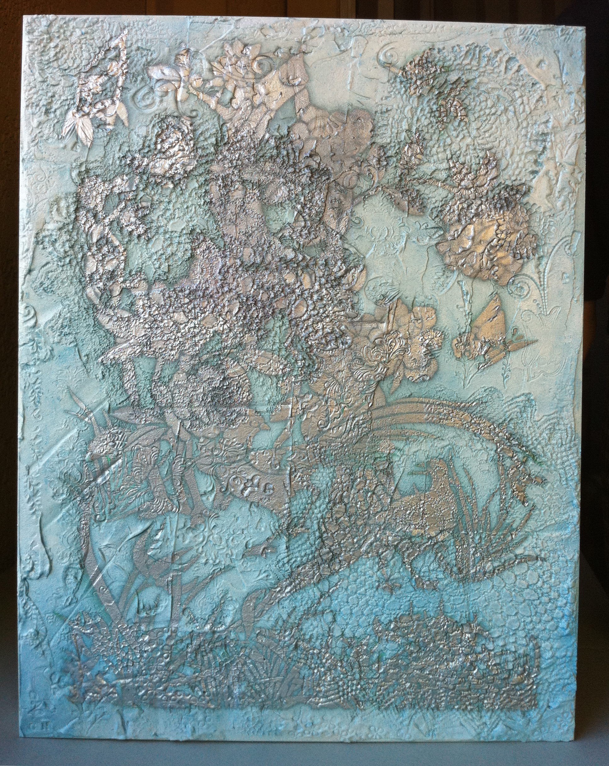 Mirage- textured joint compound and spray paint on 2 inch cradled gesso board.